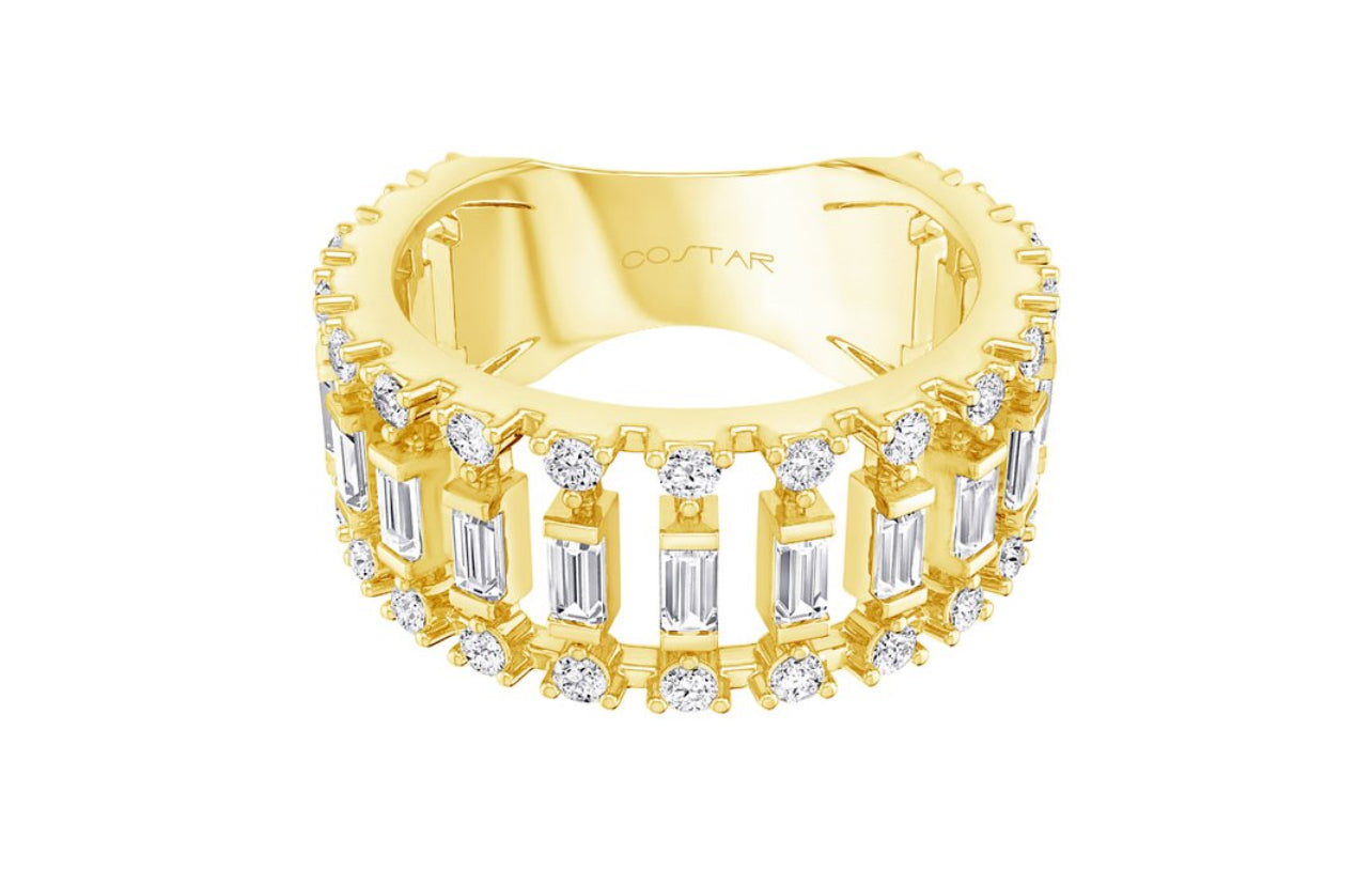 This 14K white or yellow gold open space diamond band uses baguette and round cut diamonds. The design uses the round stones along each edge as a border and channel set baguettes set between. The round cut stones are set in a 3 prong setting and the baguette cut stones are set in channel settings. The diamonds have a total carat weight of 0.82ct with a color of F-G and a clarity of VS2-SI1. The ring is a stock size 7. The band is available to special order ONLY. The ring is available to order in 14K white gold or 14K yellow gold in sizes 5-9. Please allow up to 5 weeks for special orders.